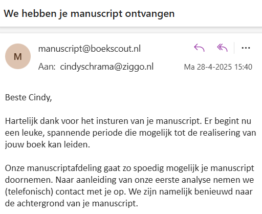Er breekt een spannende periode aan die mogelijk de realisatie van mijn boek dichterbij brengt. De manuscriptafdeling zal mijn manuscript doornemen en neemt na hun eerste analyse telefonisch contact met mij op.