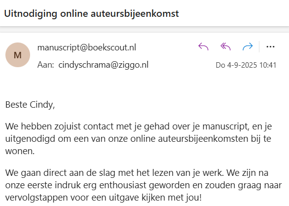 Yes! Ik ben gebeld over mijn manuscript en uitgenodigd voor een online auteursbijeenkomst. De uitgever is enthousiast geworden en wil graag de vervolgstappen zetten richting publicatie. Ik heb inmiddels ook een account bij de uitgever en ben van harte welkom geheten bij de Uitgeverij!