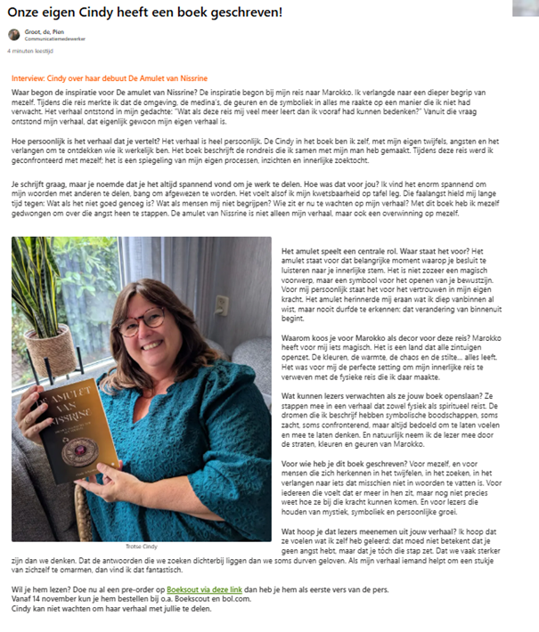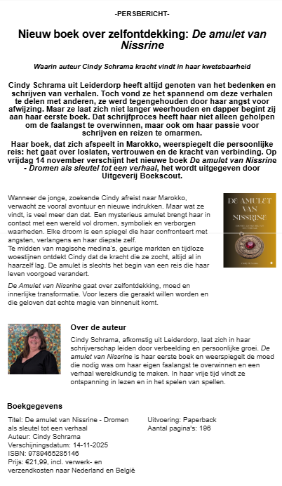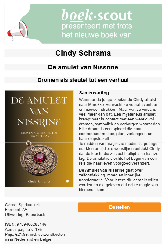 Ik vind het enorm spannend om mijn woorden met anderen te delen, bang om afgewezen te worden. Het voelt alsof ik mijn kwetsbaarheid op tafel leg. Die faalangst hield mij lange tijd tegen: Wat als het niet goed genoeg is? Wat als mensen mij niet begrijpen? Wie zit er nu te wachten op mijn verhaal? Met dit boek heb ik mezelf gedwongen om over die angst heen te stappen. De amulet van Nissrine is niet alleen mijn verhaal, maar ook een overwinning op mezelf.